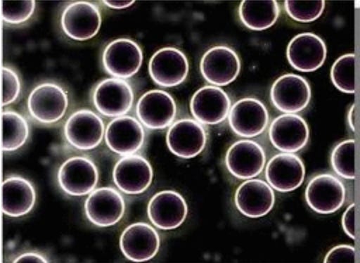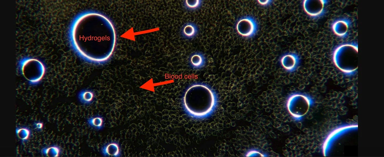Just so you fully understand what you are seeing, the normal blood cells shown in the image above are the little tiny, comparatively non-glowing circles in the background below. The huge glowing bubbles below- many times larger than blood cells - are what are being described as hydrogels.